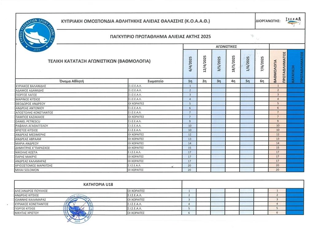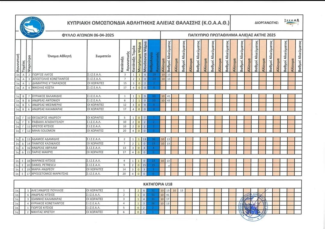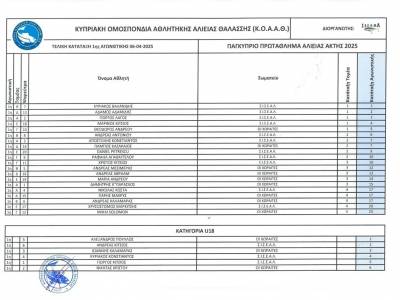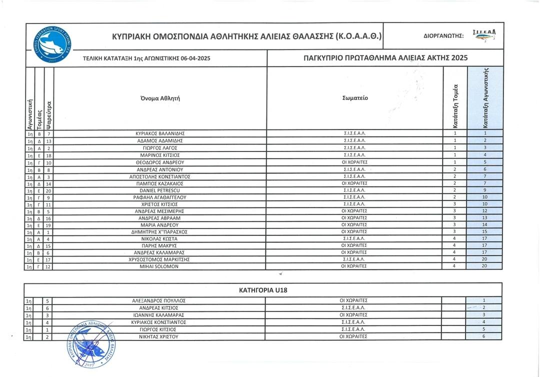 1η Αγωνιστική 6/4/2025 Επαρχία Λεμεσου, παραλία Αγίου Ερμογενη. Αποτελέσματα Αγωνιστικής (φύλλο αγώνα) Τελική κατάταξη 1ης Αγωνιστικής Τελική κατάταξη Αγωνιστικών (Βαθμολογία)